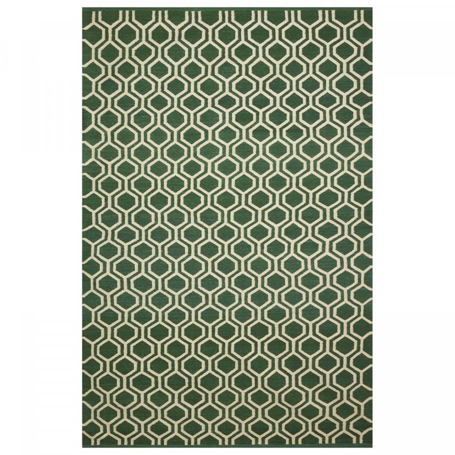 Varanasi matto, Chhatwal & Jonsson. Tyylipuhdas, persoonallinen matto joka on valmistettu huolella kulutuksenkestävästä villasta. Matto on pohjaväriltään vihreä ja se on koristeltu hienovaraisella, luonnonvalkoisella ympyräkuvioinnilla. Ihastuttava yksityiskohta makuuhuoneeseen, eteiseen tai olohuoneeseen. Jokainen matto on käsinvalmistettu joten eroja saattaa ilmetä.